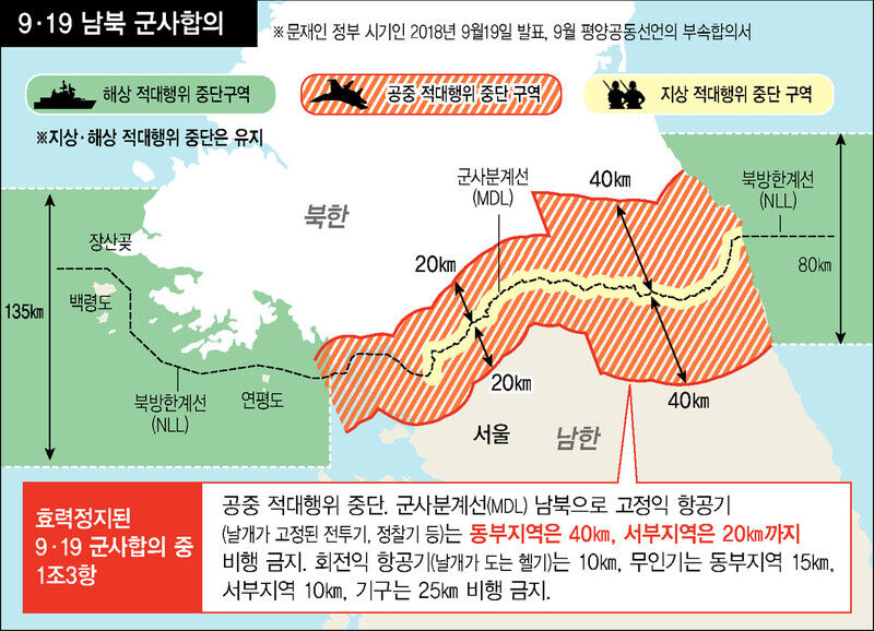남북 모두 9·19 군사합의를 무력화하며 접경 지대에서의 군사적 긴장은 한층 고조될 가능성이 커졌다. 2018년 4월 판문점 선언의 후속 조치로 그해 9월 평양에서 체결된 9·19 군사합의는 지상·해상·공중에서 군사적 적대 행위를 금지하며 군사분계선 일대에 완충 지대를 설정하는 내용이 핵심이다.